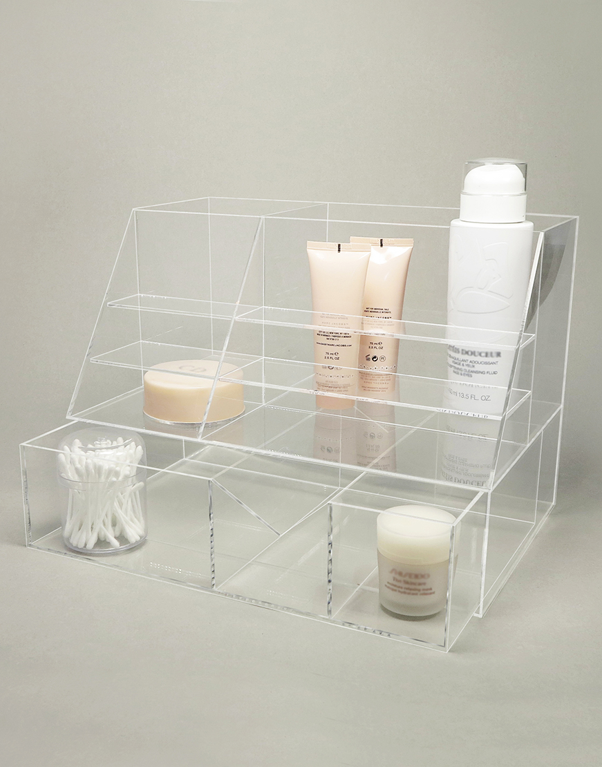 This cosmetic storage B is designed for organizing the skincare product. The back of the storage is suggested to contain the large and high bottles. The inside of the front drawer is separated into sections for the convenience in categorizing items. The front steps are used to contain powder and other cosmetic product.